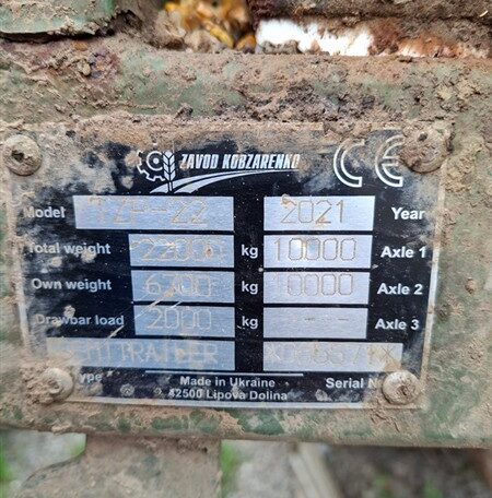 Remorca universala tractata cu perete impingator (push-off trailer), capacitate de incarcare: 16.500 kg, masa totala tehnic admisa: 23.450 kg, volum benă: 22-26 m³, 2 osii tandem ADR Italia cu distanta intre osii 1.810 mm, osie tubulara 130x2150, autodirectie pe puntea din spate, anvelope 560/60 R22,5 (sarcina 6.300 kg la 40 km/h), sistem de franare pneumatic dublu circuit Wabco cu ALB automat, sistem de descarcare orizontala cu perete mobil actionat hidraulic (2 cilindri hidraulici), obloane laterale si posterior, oblonul posterior se deschide hidraulic, timon hidraulic cu suport mecanic, inel de cuplare Ø40 mm, scara de acces, aparatori noroi fata si spate, cutie scule, volum ulei hidraulic necesar: 26 litri, presiune hidraulica tractor necesara: 180- 210 bar, putere tractor necesara: 150-200 CP, dimensiuni benă L×l×H: 5.640×2.475×1.950 mm, dimensiuni totale L×l×H: 7.630×2.695×3.495 mm, culoare benă RAL 6003 (verde), cadru RAL 7016 (gri antracit), instalatie electrica de semnalizare rutiera etc
